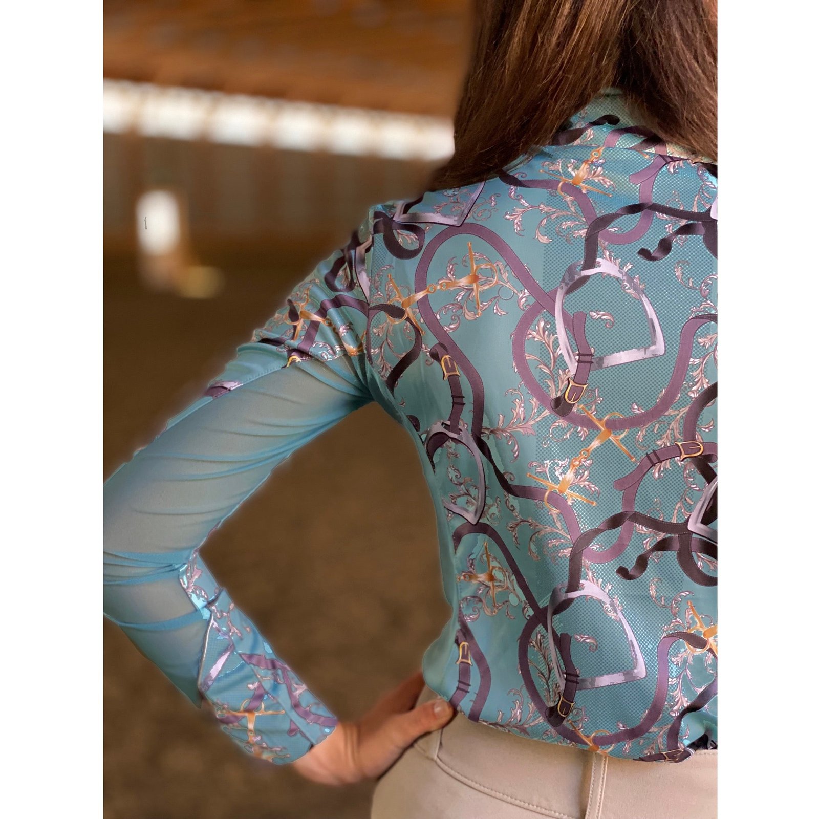 *note that the color of the stirrup leathers on the shirt is more of a dark gray – although they appear purple/blue in this picture.