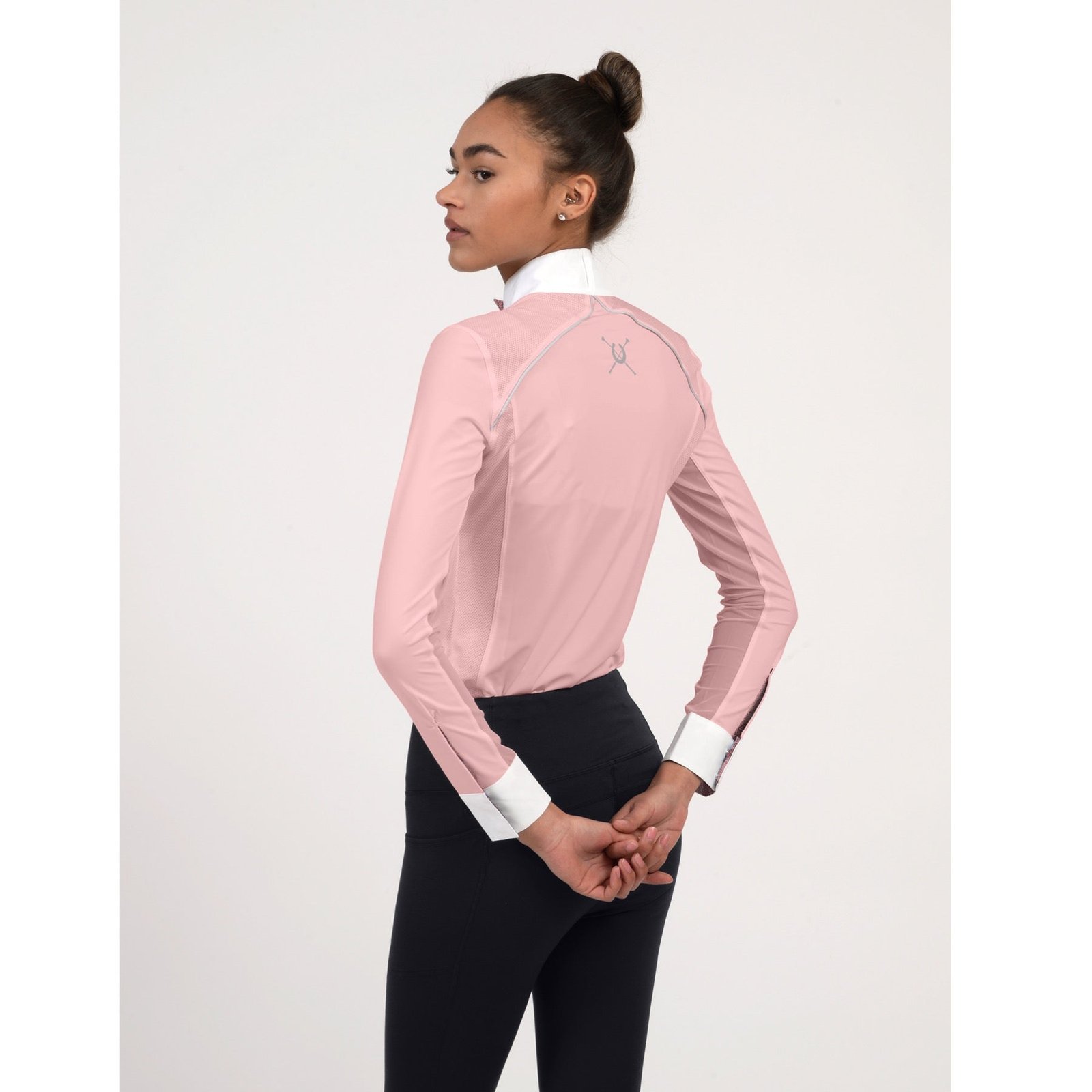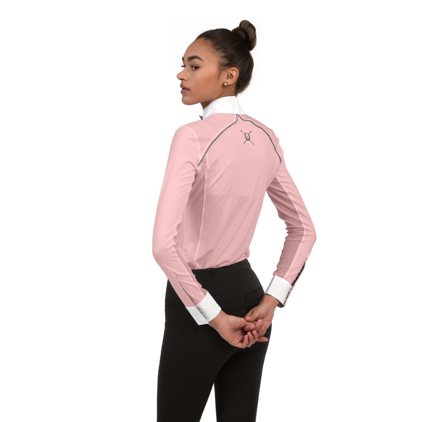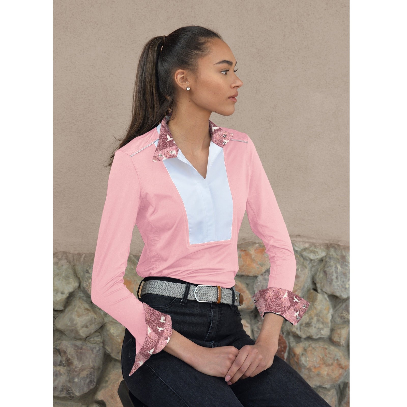 You asked for a SkyCool® Show Shirt, and this shirt delivers. Made of the lightest weight fabrics to give you the lightest sun shirt ever. Feel the cooling comfort in warm, humid weather conditions by converting sweat into cooling energy to stay dry and comfortable. SkyCool® fabric is infused fiber technology for cooling, moisture absorption, fast drying, 2-way air circulation, and 50+ UV protection. 4-way stretch flat weave fabric offers more stretch and superior comfort. Classic white poplin bib, collar, and cuffs lined with unique Liberty® London prints, mesh shoulders, sides, and underside sleeve inserts add cooling airflow. Pull-over style shirt features a hidden low profile YKK zipper placket, no-show collar, and cuff snaps for a polished show look, stock tie loop, shirttail hem, and tailored show fit.