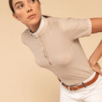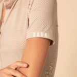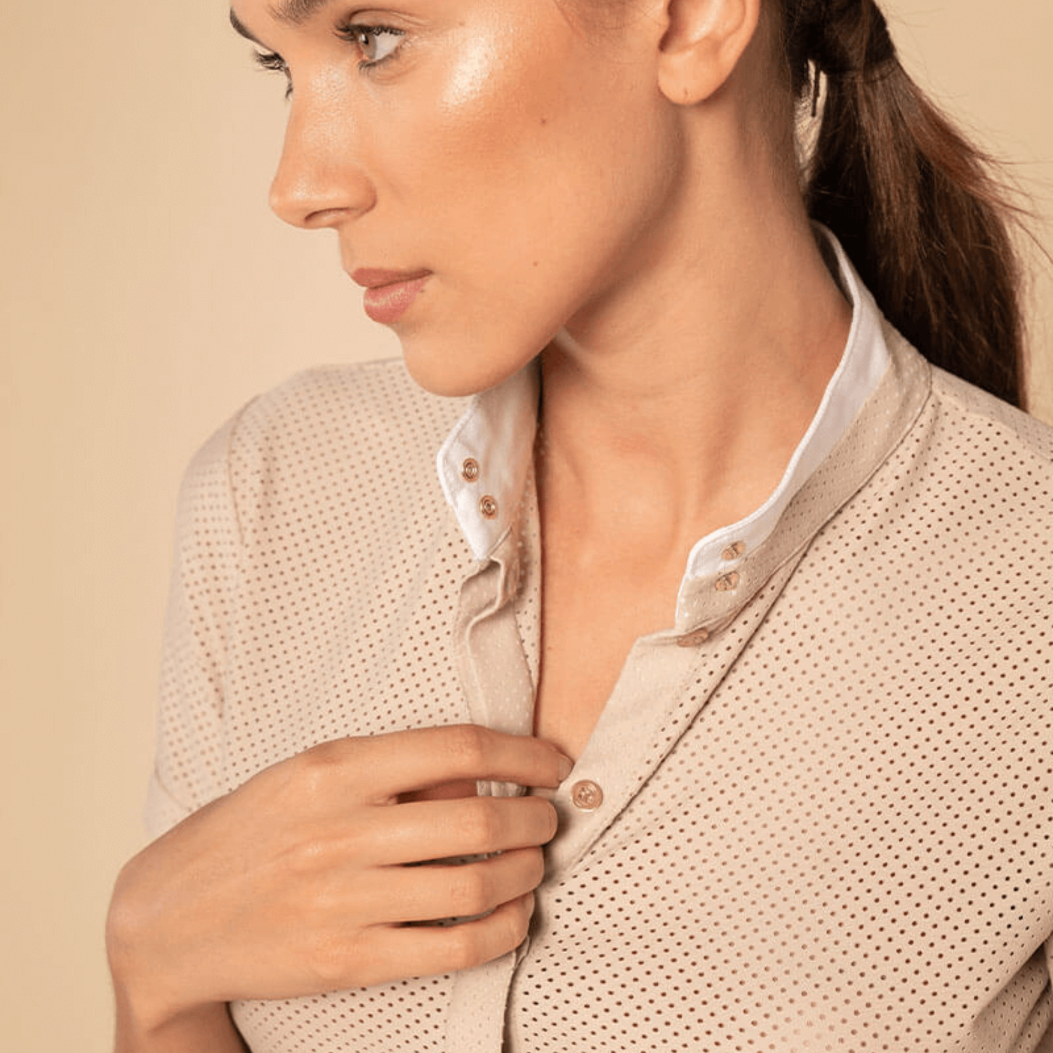 Micro-perforated short-sleeved technical polo shirt for summer with a refined design. Rigid officer collar. Slim fit but not adjusted to emphasize the waist. Long front opening, invisible buttons. DADA logo on the left sleeve. Perforated and eco-responsible technical fabric. The polo shirt’s design is very clear: the buttons are hidden under a button placket—a graphic panel on the back. The fabric is micro-perforated for great breathability and density, preventing it from being transparent.