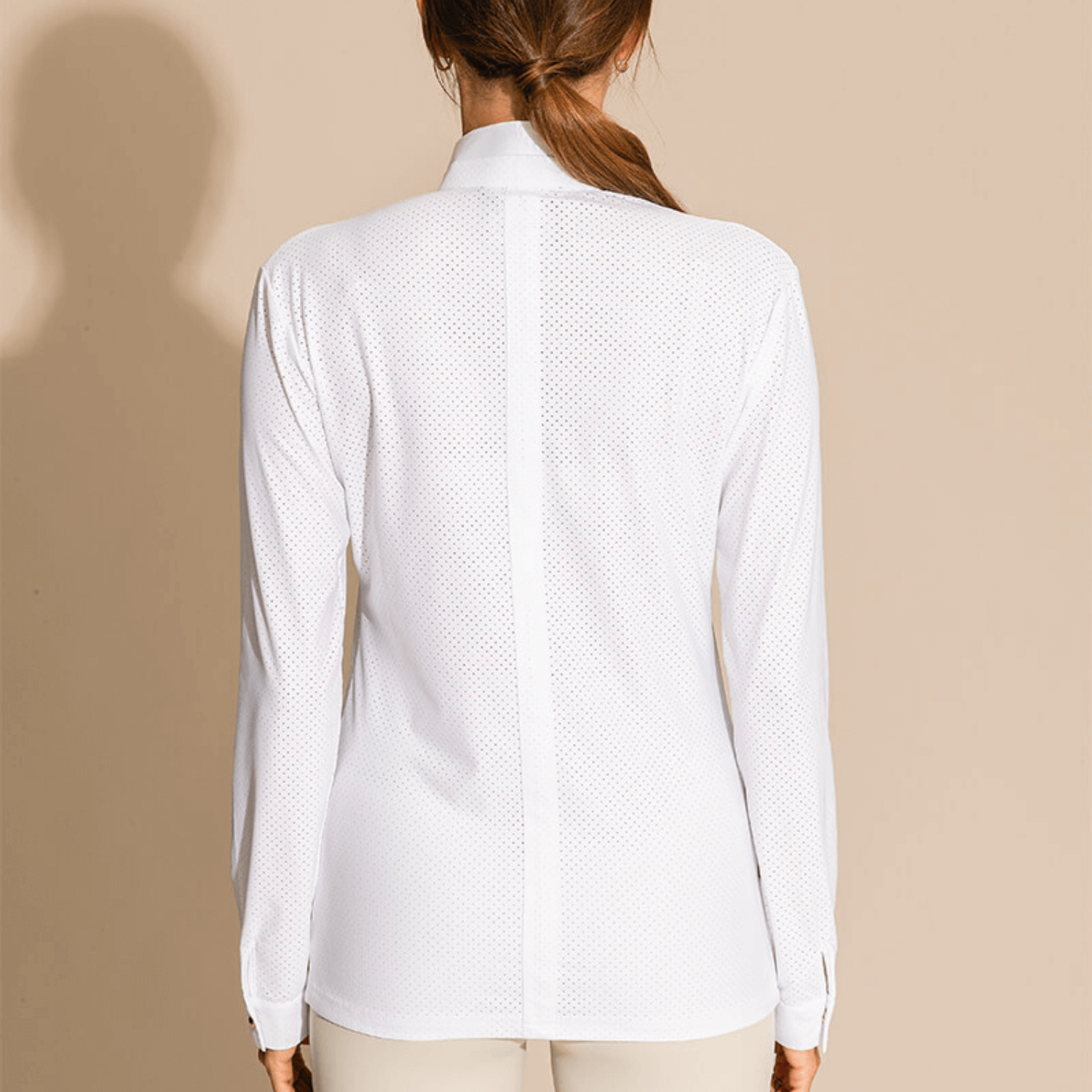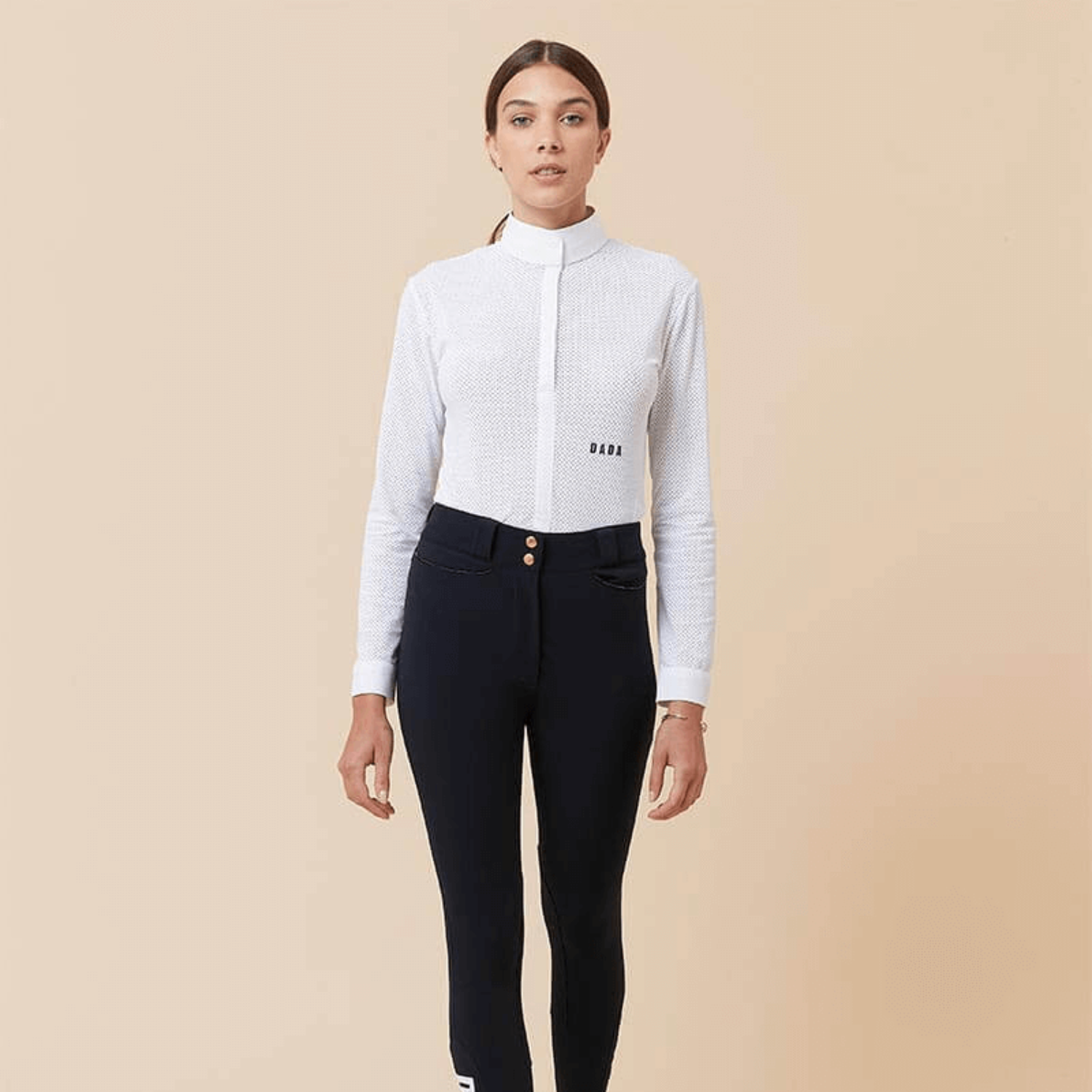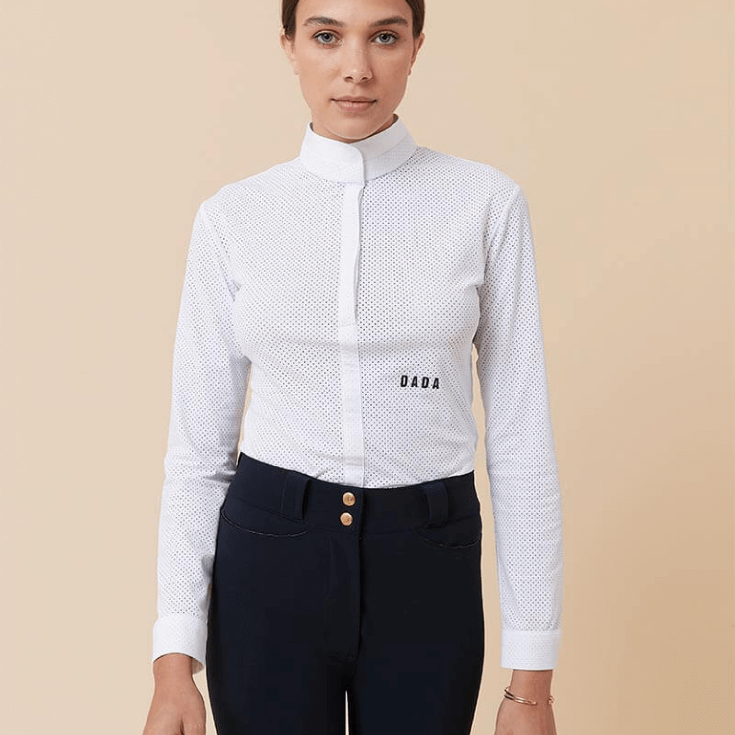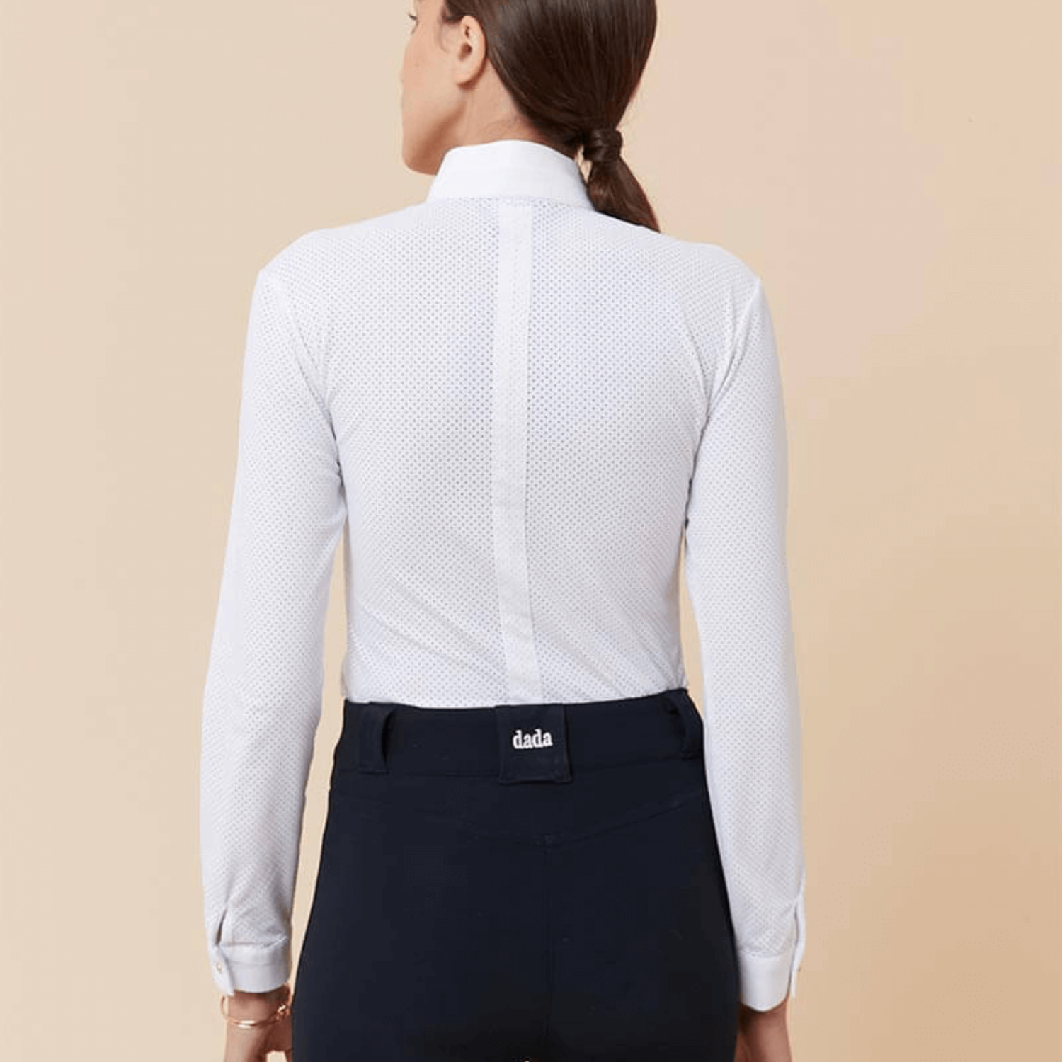 Technical polo shirt long sleeves microperforated, sleek design. Rigid officer collar and front opening, invisible buttons. DADA logo on the front left waistline—eco-responsible technical fabric.
