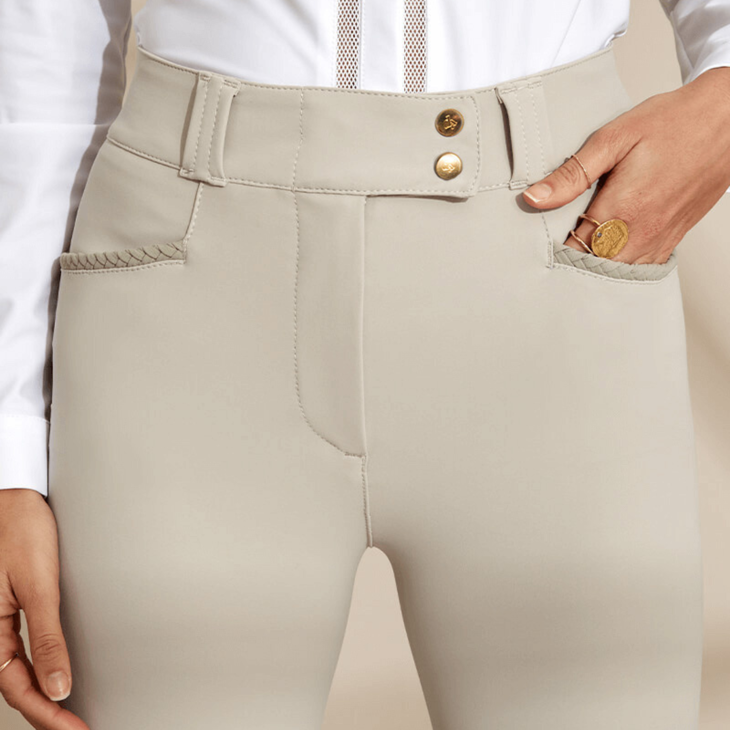 The riding pants in the Dada Sport range are designed in microfiber for maximum movement. Their immediate push-up effect also ensures a flattering curve, while the jean stitching on the back, the technical and aesthetic grip and the braids on the pockets add an ultra-feminine touch to their style.