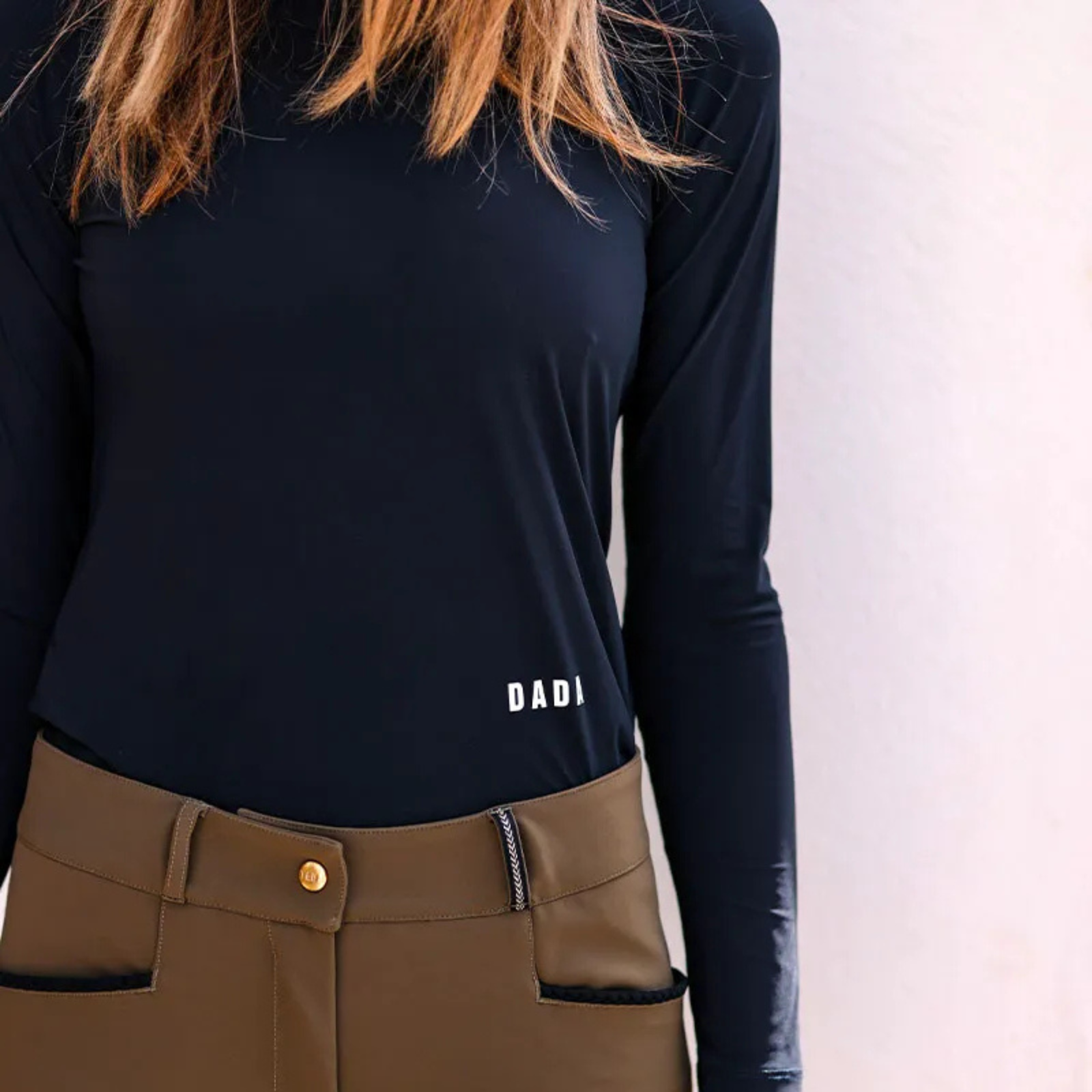 Lightweight, long-sleeved technical riding T-shirt designed for riders seeking comfort and performance. Made from ultra-breathable, lightweight, and UV-protective Italian fabric, it offers a slim fit and a stand-up collar, ideal for riding. Available in coffee, black, and navy, this style combines elegance and practicality thanks to its easy care.