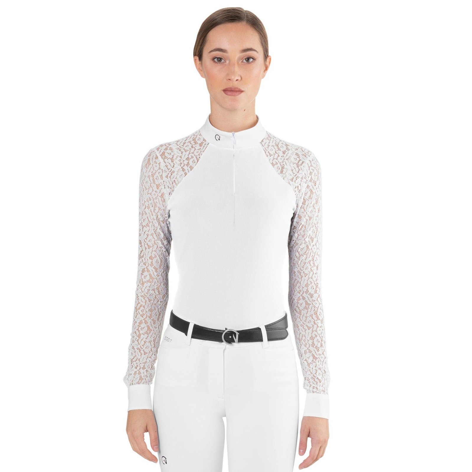 Ladies Long Sleeve Show Shirt Florentine – jaw dropping elegance combines with high tech performance to bring you this incredibly luxurious ladies long sleeve competition shirt from Italian brand Ego7. The high tech, quick drying and highly breathable main fabric is complimented to perfection with beautiful lace detailing on the arms to give the shirt a dignified look. The anti-wrinkle fabric ensures it is easy care when away competing. The final touches of a crisp white collar and sleeve ends add definition to the shirt to give it a professional look without taking away from it’s exquisite looks.Â