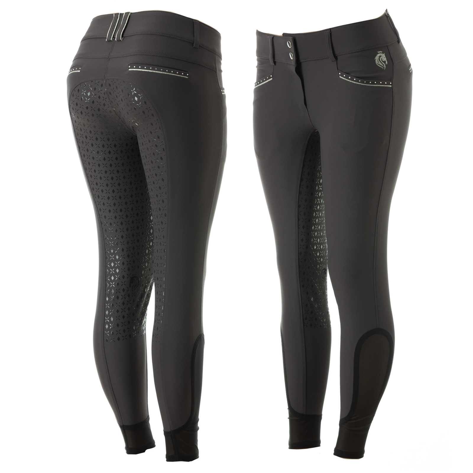 The Equinavia Victoria Womens Silicone Full Grip Breeches are made of high quality technical fabric that is breathable, moisture-wicking, and quick-drying. Spandex provides stretch for maximum freedom and support while keeping its shape. Silicone grip offers ultimate security in the saddle, while mesh at the lower legs keeps you cool and streamlined underneath the boots. Finished with a silver lurex logo on the left pocket as well as silver piping and crystals on the front pocket and the back fake pocket will make you stand out in the ring.