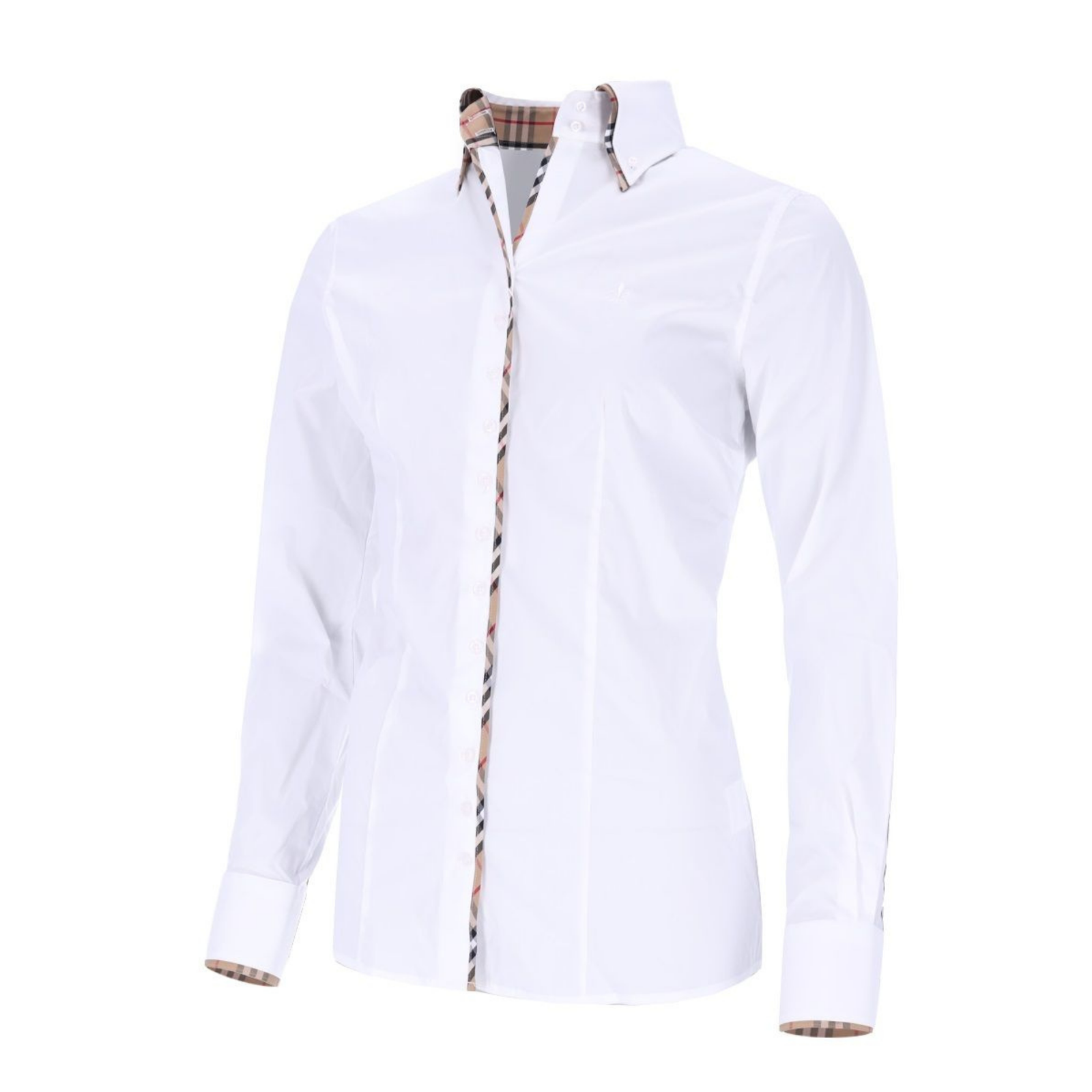 This white Fior Da Liso blouse impresses with classic elegance and finely coordinated details. The elegant double collar and button placket, lovingly trimmed with a contrasting check fabric, give it a unique, elegant look, while the checkered interior trim on the collar and cuffs creates tasteful contrasts.