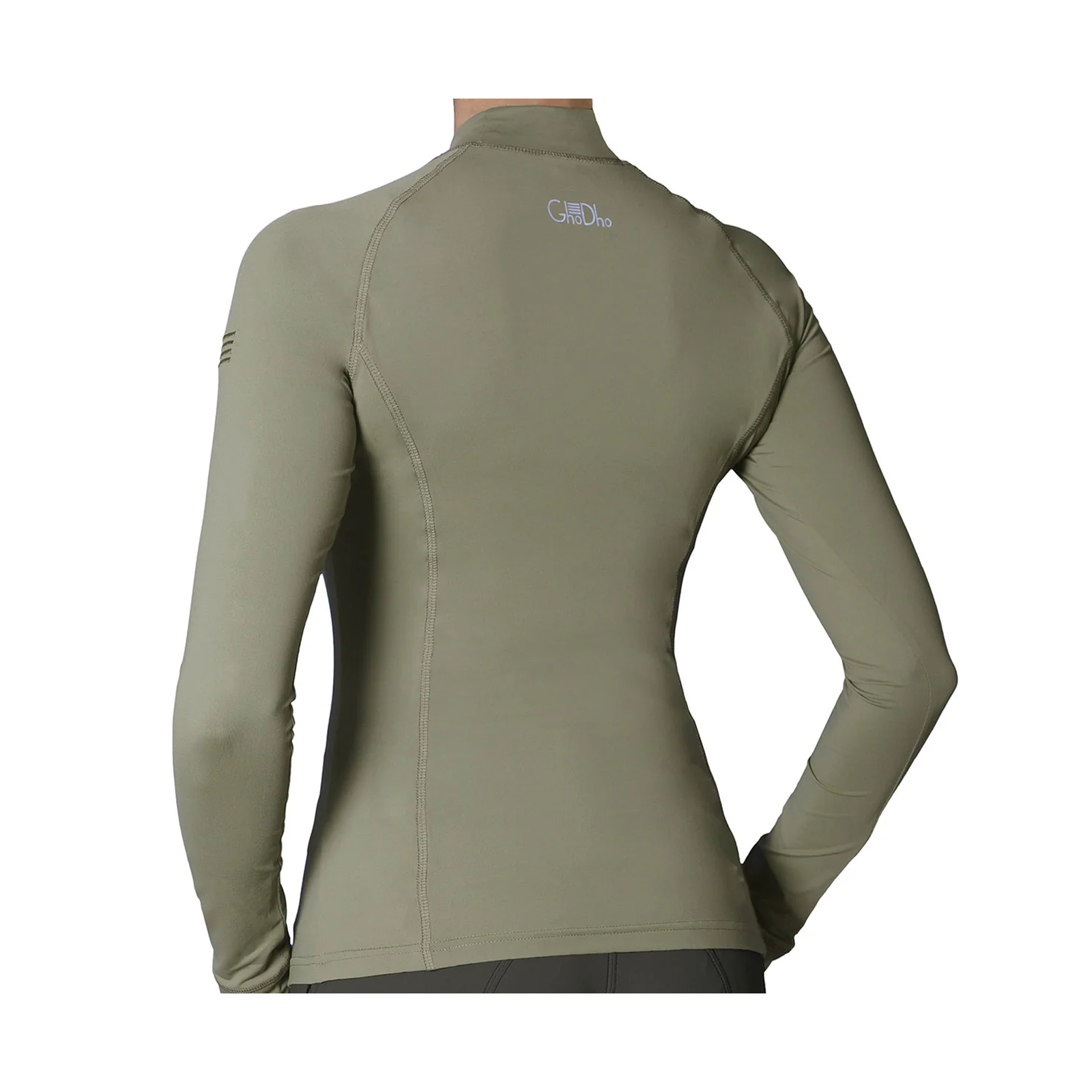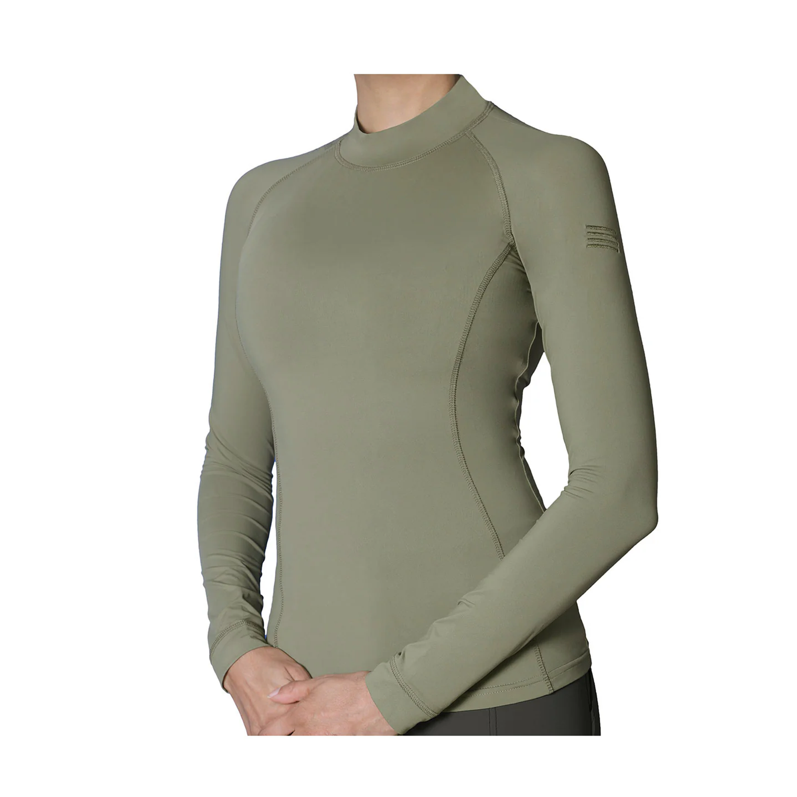 Our base layer shirts are made from Tactel® technical fabric that draws moisture away from your skin while protecting you from the sun. Our design features a sleek fit, flattering seaming, and an elegant embroidered logo on the sleeve.Â