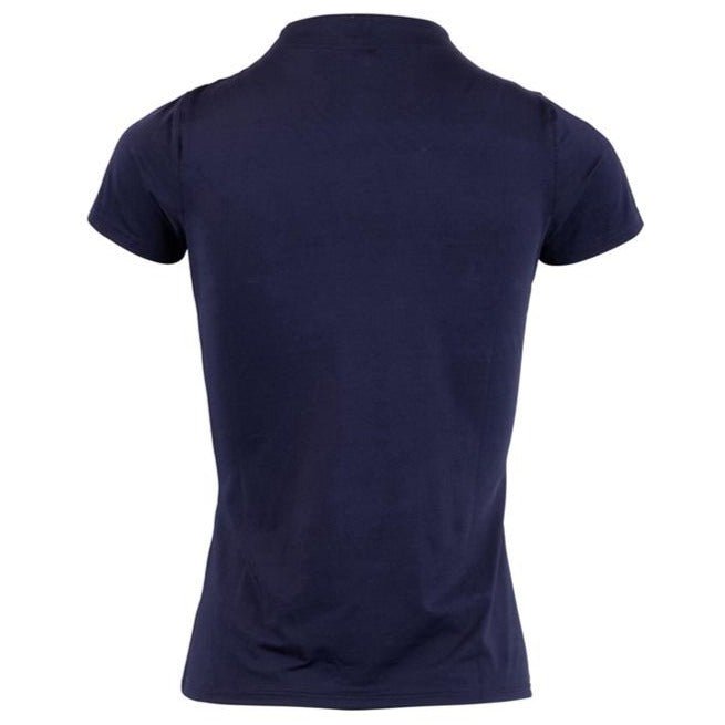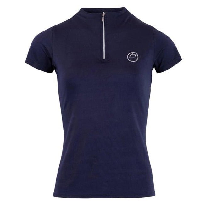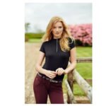 Everly Logo Polo with a low stand-up collar. In the front is a silver neck zipper and on the left side of the chest is a Montar logo in clear crystals 4 cm in diameter. The perfect polo for your classic equestrian wardrobe. The highly functional Mon-tech fabric is breathable and sweat-absorbent, which ensures a comfortable feeling even when you work hard riding your horse.