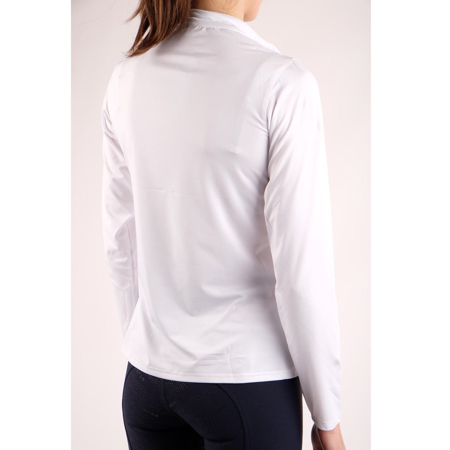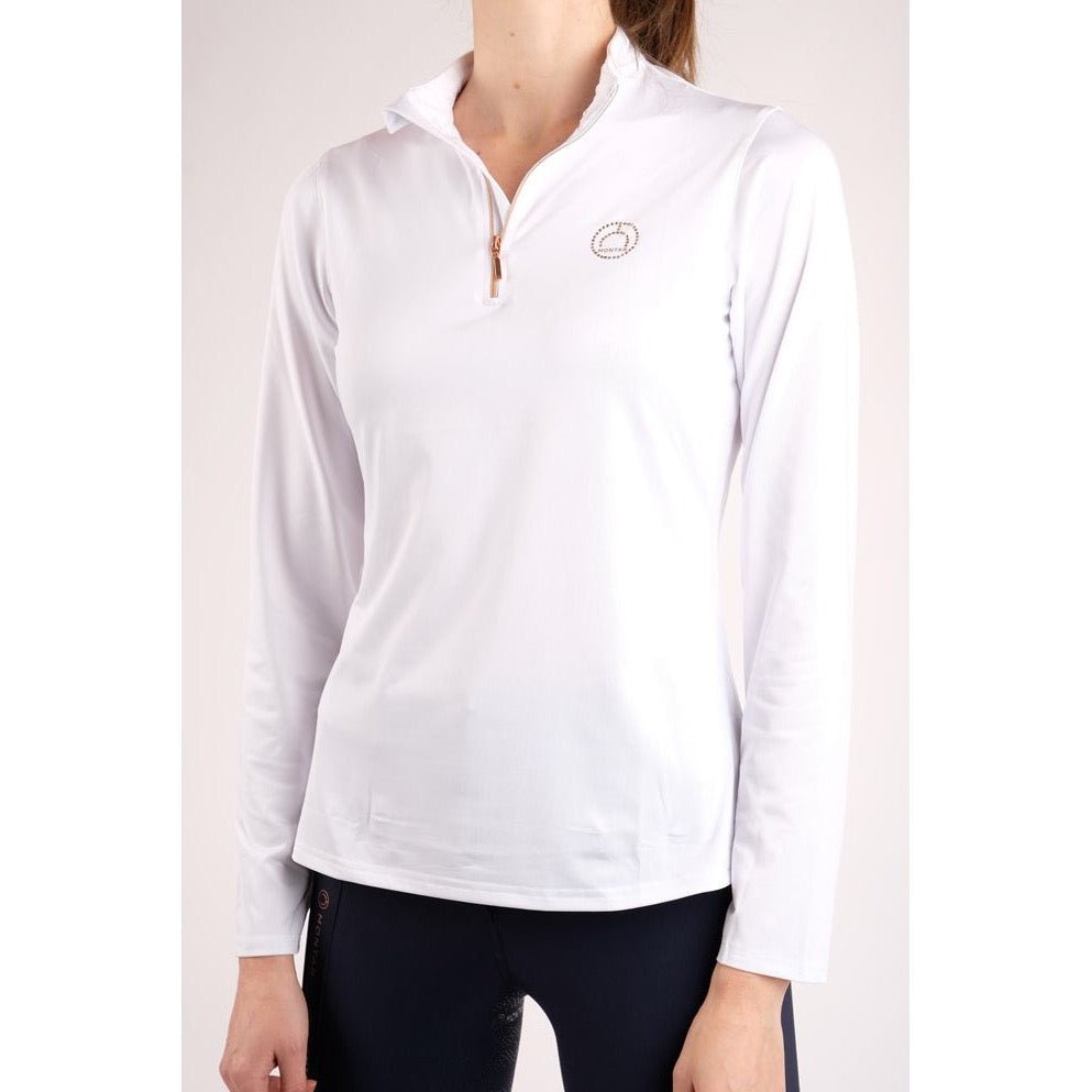 Everly Logo Polo with long sleeves and a low stand-up collar. In the front is a silver neck zipper and on the left side of the chest is a Montar logo in rosegold crystals. The highly functional Mon-tech fabric is breathable and sweat-absorbent, which ensures a comfortable feeling even when you work hard riding your horse.