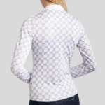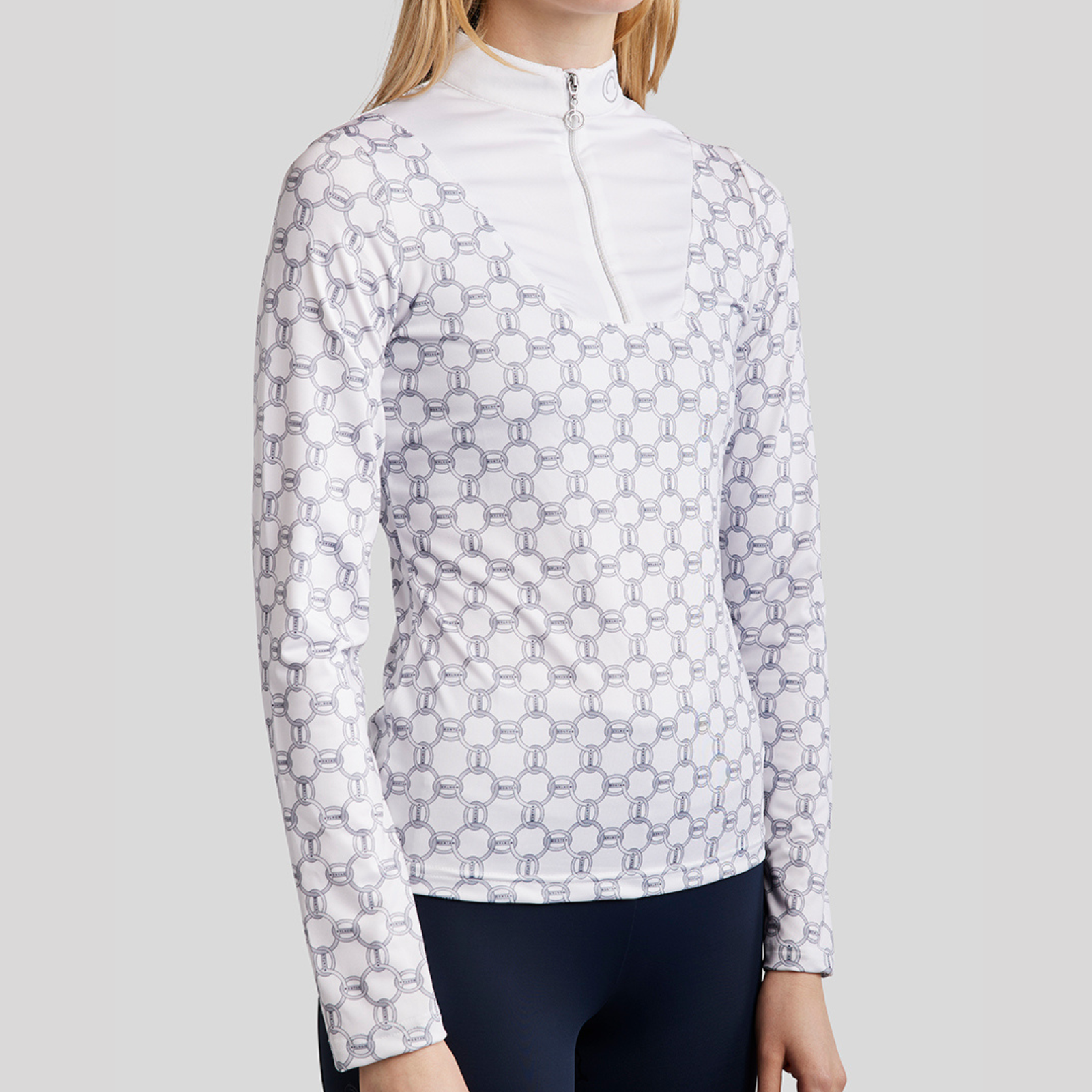 Enhance your riding experience with our chic and functional allover chain-printed training shirt. Designed for the modern equestrian, this shirt combines performance with elegance, featuring an eye-catching chain print that covers the entire fabric. The sleek neck zipper adds a touch of practicality, allowing for easy ventilation and adjustable comfort during your rides.