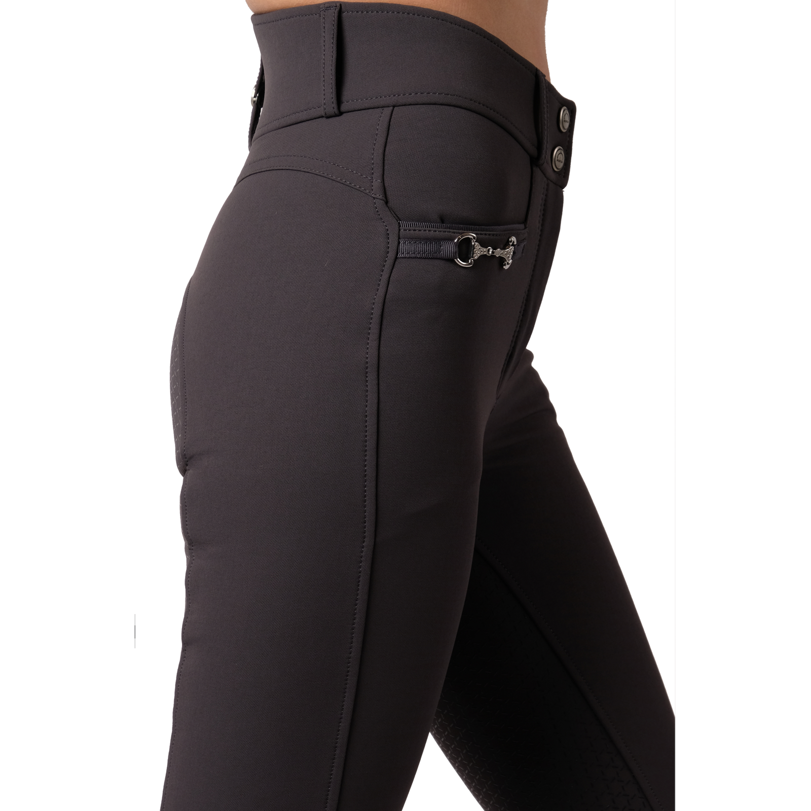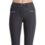 The Molly Model is part of our Essential Collection. These breeches are available in trendy high waist cut. The back has a v-cut in the waistband. That assure a tight fit at your waist. At the front there are 2 pockets, one decorated with a silver bit with small clear rhinestones on. At the ankle there is a lycra triangle for perfect fit.
