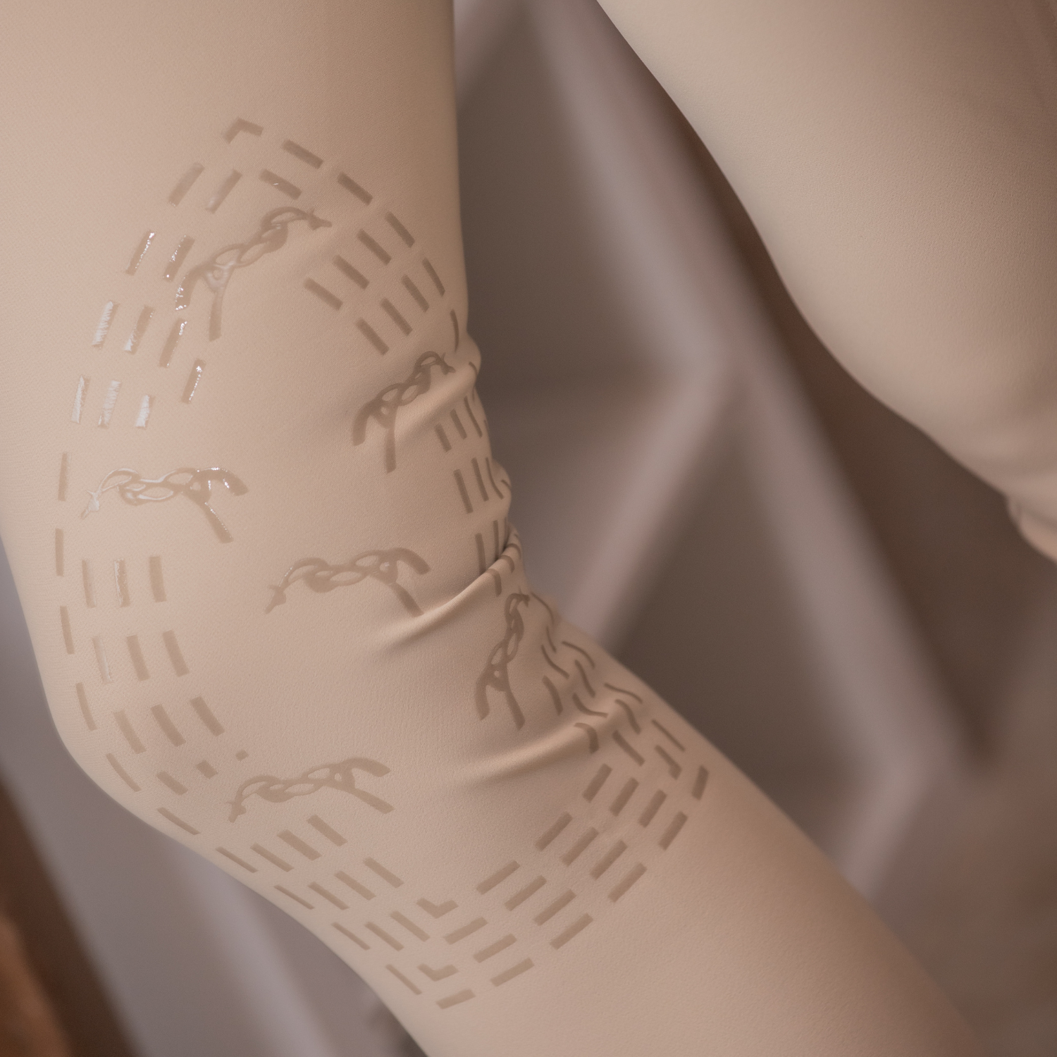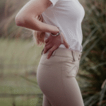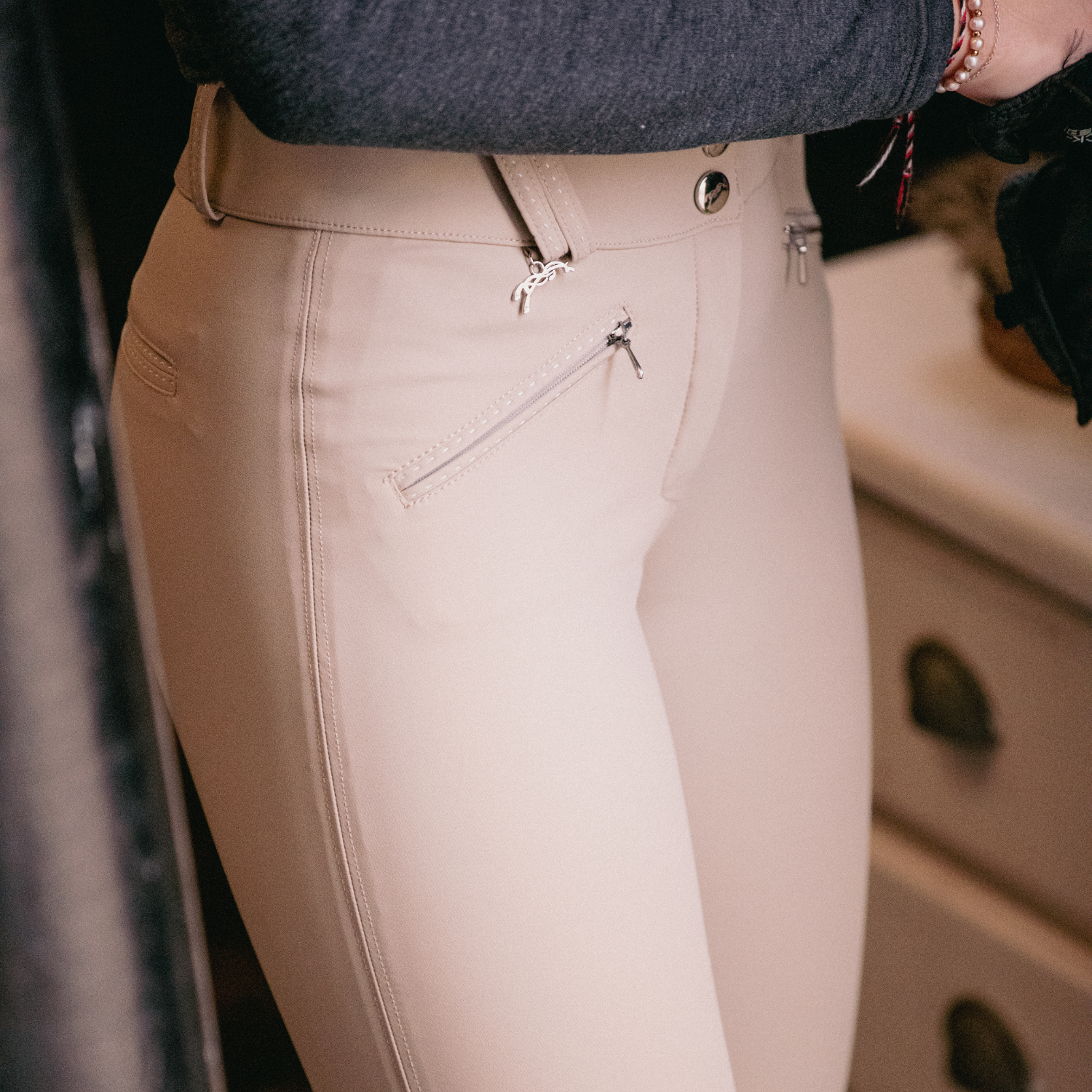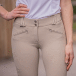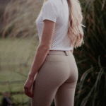 Rocky Pénélope breeches. Comfortable and technical breeches for horse riding show days. Their close-fitting cut and mid-rise waist create a perfect silhouette. They have two small zippered pockets at the front and two fake pockets at the back. Equipped with a fairly wide belt for good waist support, they fasten with two small tabs at the front and have relatively slim belt loops. Inside the knees, there is a grip area to secure the leg when in the saddle. The leg bottoms are made of lycra to accommodate various body shapes and leg sizes.