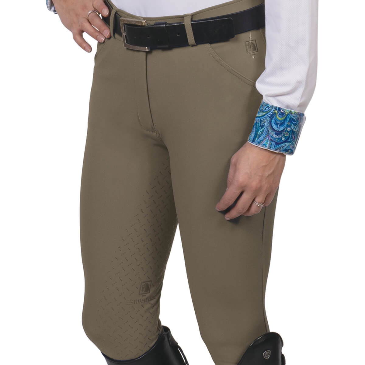 Our softest, most luxurious breech! Made of Softtouchâ„¢, a technical micro-PU fabric, with silicone knee patches for ultimate grip without compromising feel. Mid rise, with a wide, non-binding, contoured waistband and strategically placed back yoke to keep you looking your best. Stretch calf panels reduce bulk and pressure points under tall boots.