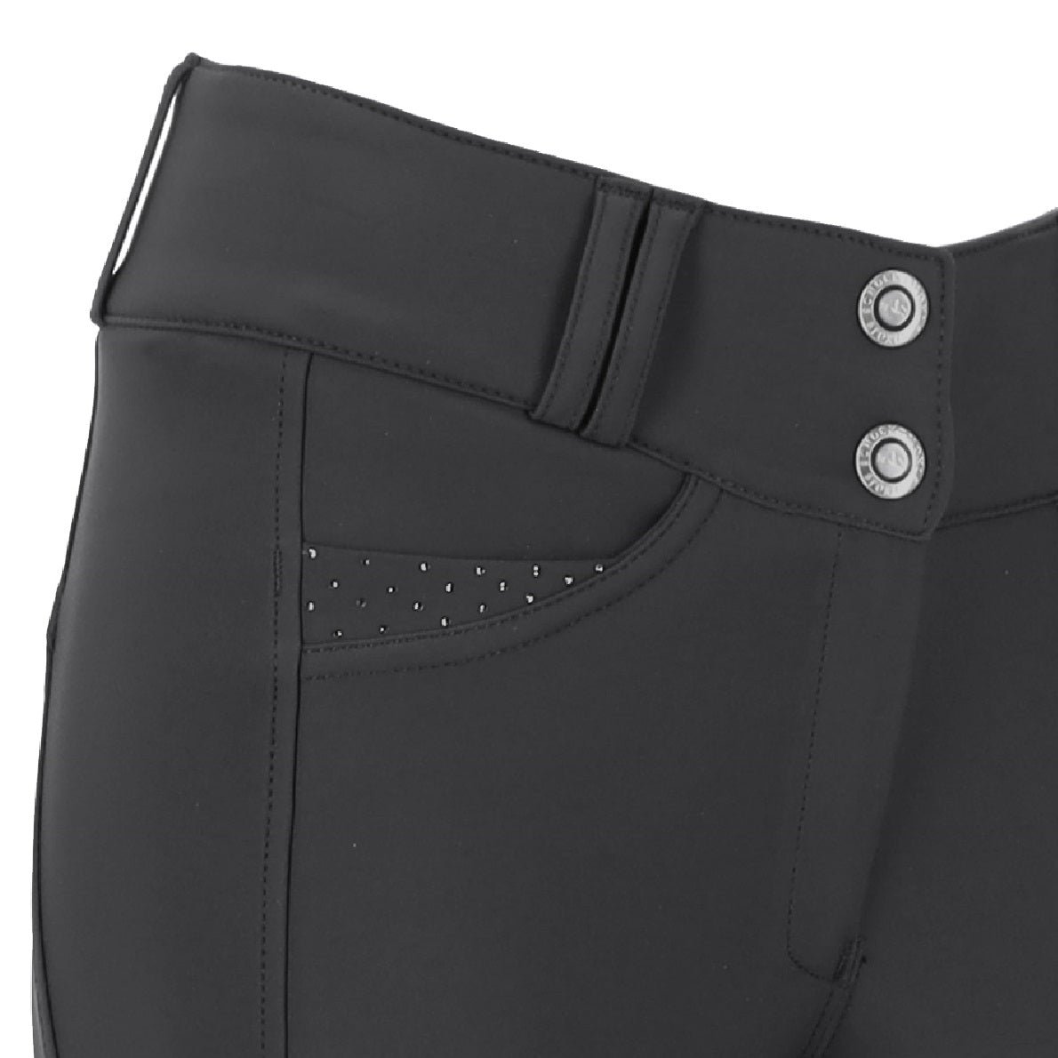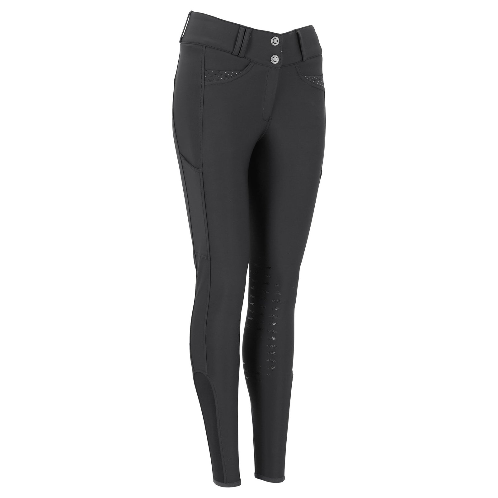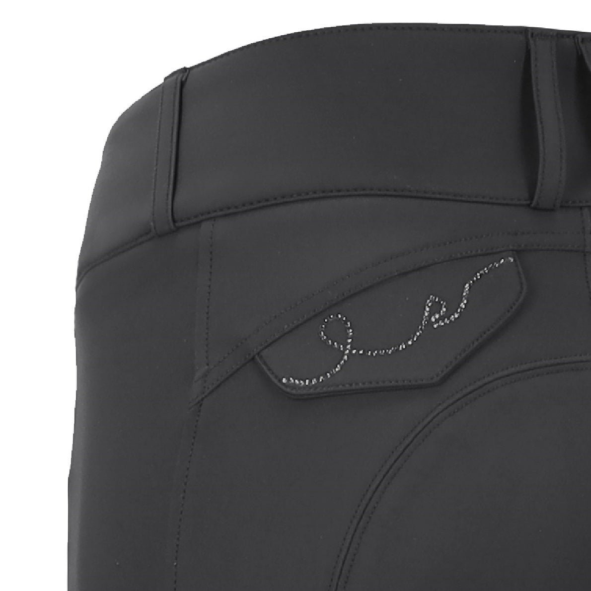 May it be a little more fancy? The elegant women’s premium breeches Darleen KG offer that little bit extra for fashion-conscious female riders. The new breeches from Schockemöhle Sports come with slide-in pockets and flaps decorated with pretty rhinestone details. The rear yoke with inserted pockets is just as eye-catching as the high waistband with two Gutos logo buttons. The side cell phone pockets prove to be practical. The women’s breeches Darleen KG (knee seat) are dimensionally stable, but elastic and made of quick-drying, breathable material.