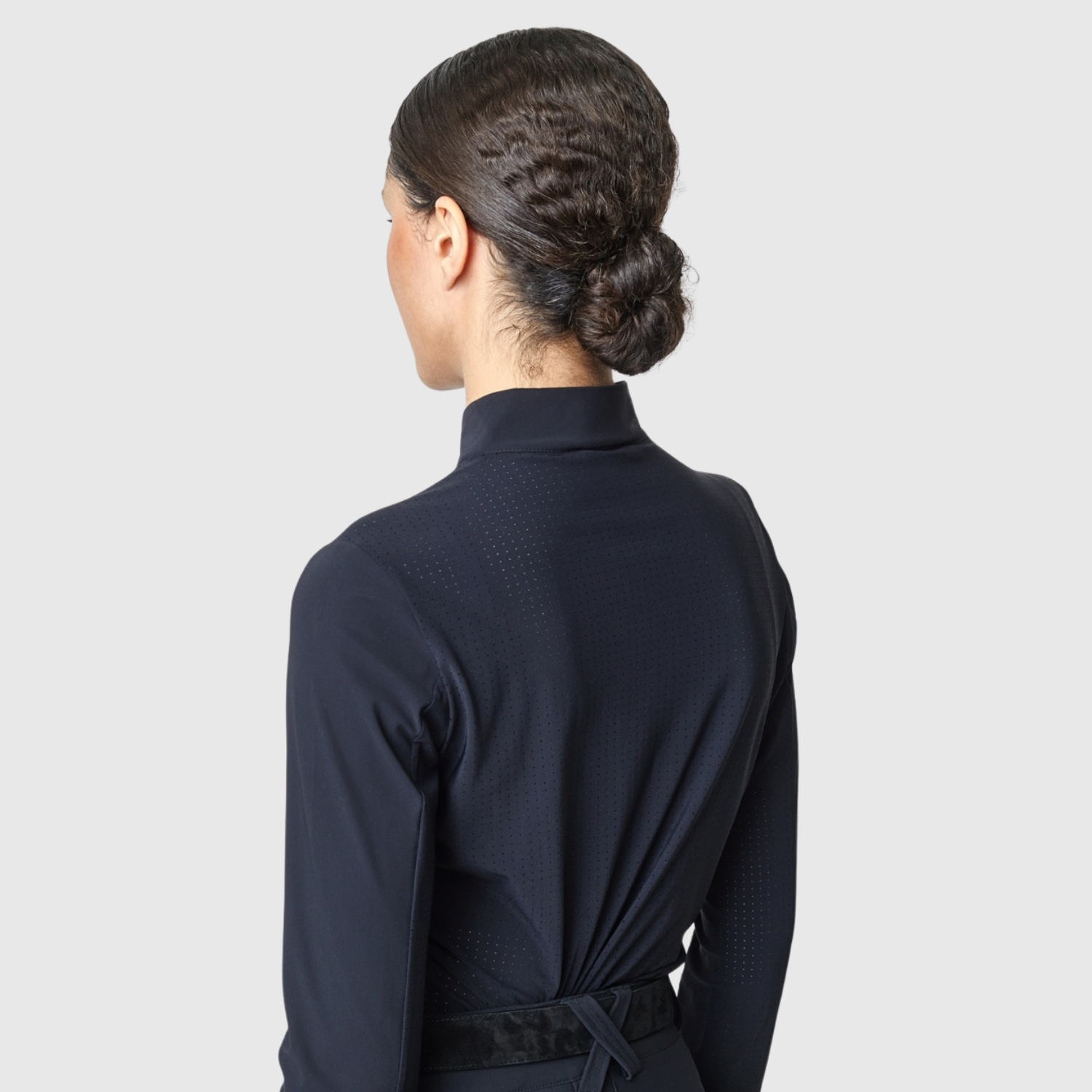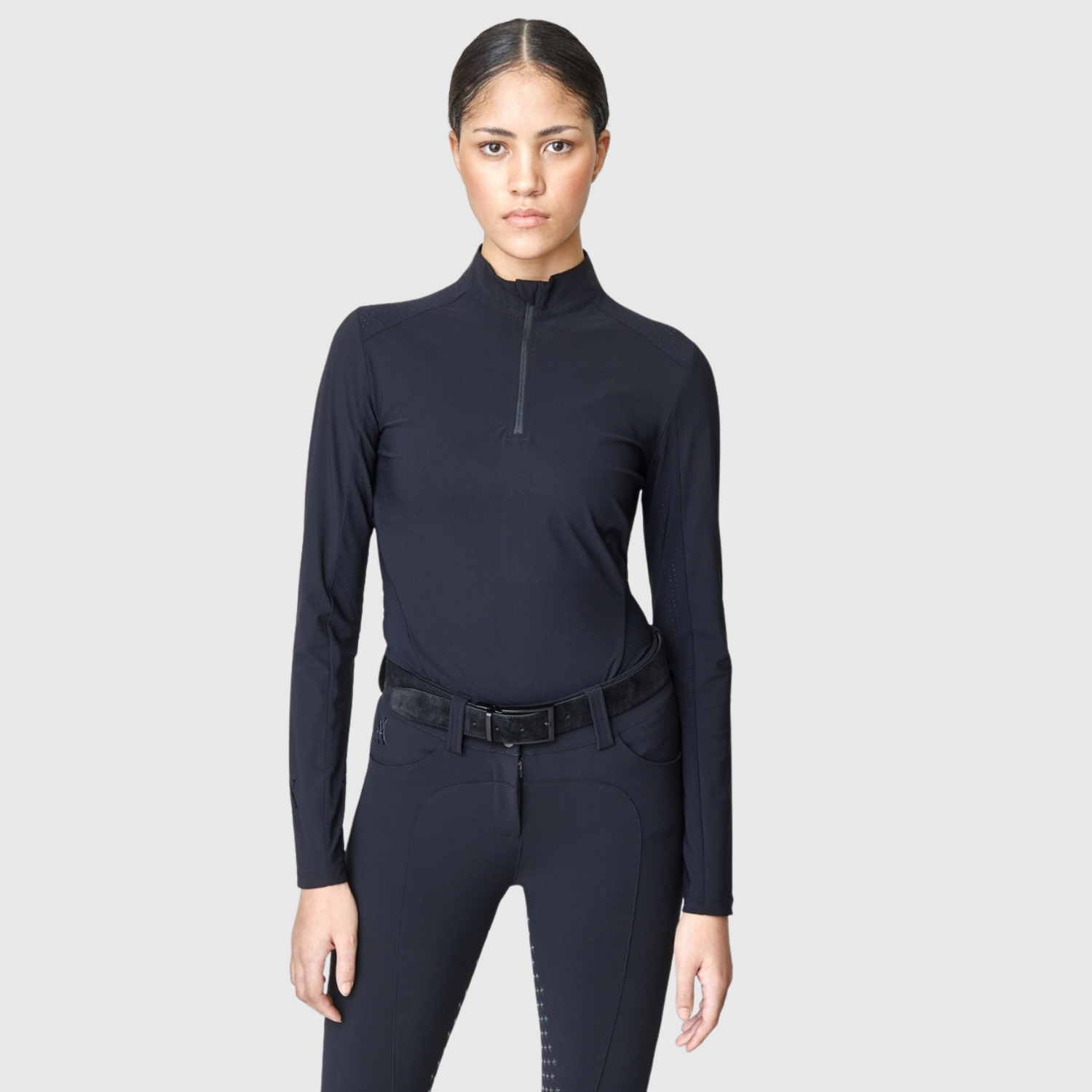 Our Performance Sun Shirt keeps you temperature-regulated and UV-protected throughout your ride. Mesh back, underarms, and shoulder details allows air to circulate, while the fibers of our Italian jersey provide built-in UV protection. Features 1/4th zipper and a firm, yet elastic, collar. The garment is fitted, but not constricting. Cut from an Italian jersey, and sewn in Portugal, Europe